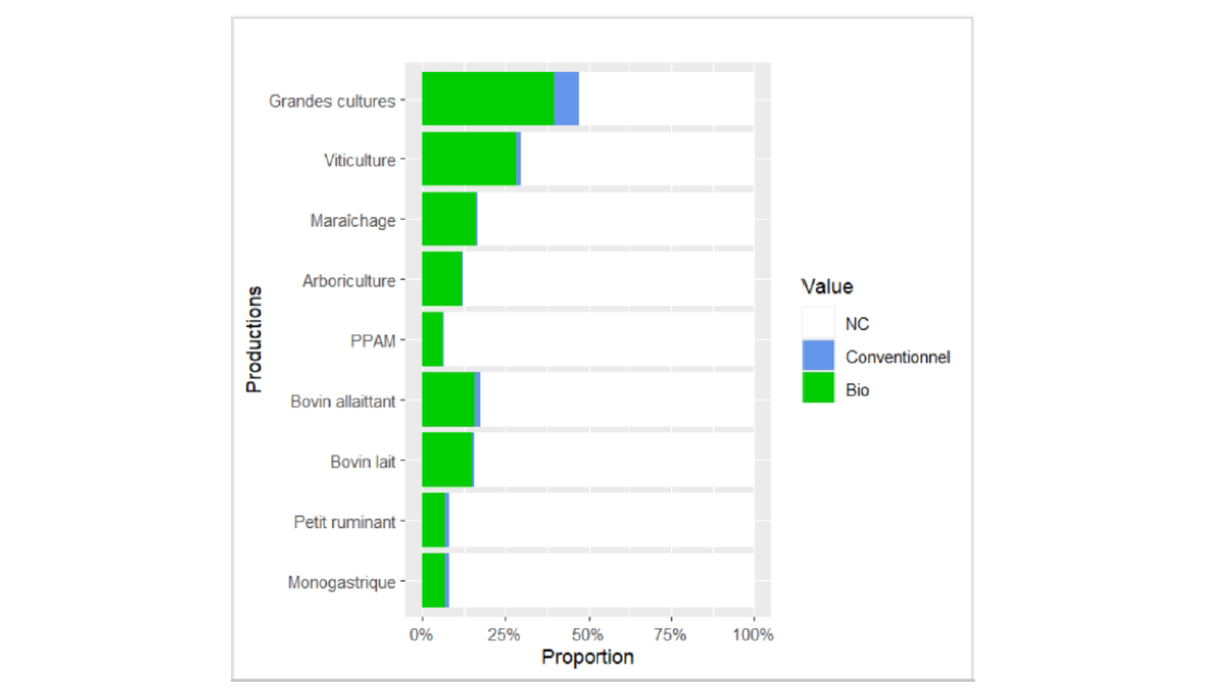 La figure 1 illustre les types d’exploitation des agriculteurs en pourcentages, ainsi que la part de la production biologique et conventionnelle sur leurs fermes. Notons que les fermes peuvent être entièrement ou partiellement biologique. Chaque agriculteur peut exercer plusieurs types de production sur sa ferme. Ainsi, la figure 1 indique que la grande majorité des types de productions sont conduites en bio. La part de l’agriculture conventionnelle dans chaque type de production est inférieure ou égale à 2 %, à l’exception des grandes cultures qui représentent 7 %.