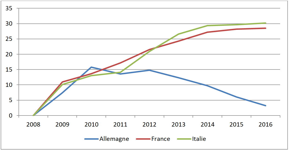 Nous examinons les éléments qui expliquent les évolutions récentes des ratios de dette publique/PIB en Allemagne, en France et en Italie depuis la création de l’Union Économique et Monétaire (UEM) en 1999 jusqu’en 2016. Nous soutenons que pour maintenir la soutenabilité des dettes publiques durant un épisode de contraction sévère de l’activité, deux conditions doivent être simultanément remplies : une situation budgétaire initiale suffisamment robuste et une volonté politique affirmée d’assainir les finances publiques. Nous montrons que, dans la période qui a précédé la crise, seule l’Allemagne remplissait ces deux conditions. L’Italie affichait une ferme volonté politique pour assainir ses finances publiques mais, lorsque la crise a éclaté, cet engagement a été mis à mal par un niveau initial de dette publique trop élevé. Au contraire, alors que la France bénéficiait d’un niveau de dette publique modéré et comparable à celui de l’Allemagne, elle n’a pas fait preuve de détermination à mettre en œuvre une politique de consolidation budgétaire.